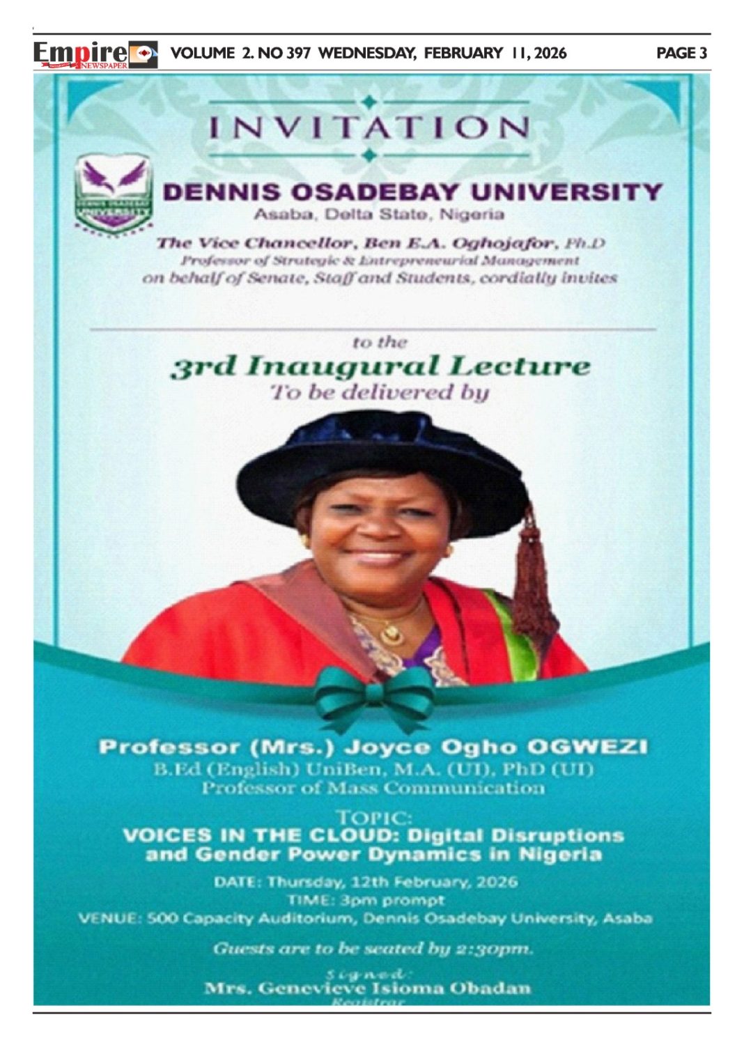 All roads will lead to Dennis Osadebay University, Asaba, Delta State, Nigeria, tomorrow (Thursday 12th February 2026) as a Mass Communication guru, Professor Joyce Ogwezi delivers her Inaugural Lecture.