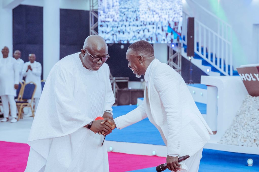 *Delta State Governor, Rt Hon Sheriff Oborevwori (left), being welcomed by the General Overseer, Jesus Christ Temple Ministry, Pastor Amos Evomobor during the dedication service of the Church at Effurun, Uvwie LGA on Sunday. Pix Enarusai Bripin