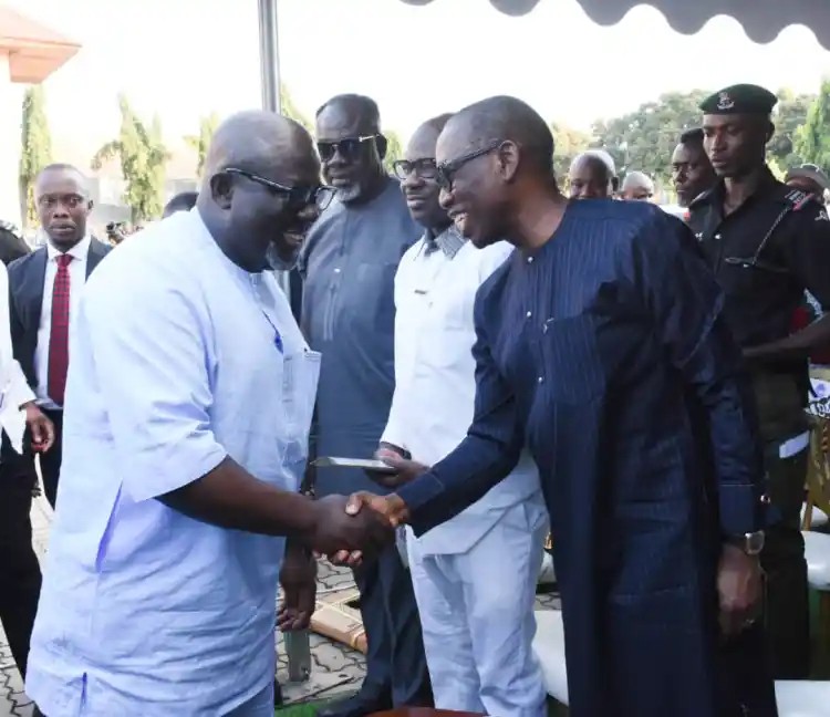 Caption: Okowa in warm hand shake with Governor Sheriff Oborevwori at the Service of Songs on Tuesday night at Asaba